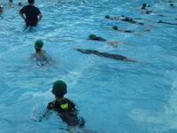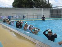 5年生の水泳は着衣泳を体験しました。シャツを着てズボンと靴を履いた状態で水に入ると思うように動けないことを体験した後は、2人組になって仰向けで浮く練習をしました。力を抜いて手を広げて「大」の字になって浮くことがポイントです。「浮いて待つ」がキーワードです。