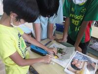 3年生図工の授業の様子です。外で採ってきた7枚の葉っぱを使って、レイアウトを考えながらテープで貼り付けています。1枚の葉っぱ、茎のついた葉っぱ、大きい葉っぱなどお気に入りの様々な葉っぱで自然の色を楽しんでいます。