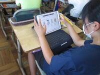 4年生算数の授業の様子です。80枚の色紙を20枚ずつ分けると何人に分けられるかという問題についてどのように考えればいいのかをタブレットに図を用いながらまとめています。10の束で考えると分かりやすそうです。