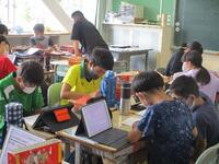 総合的な学習の時間の調べ学習の様子です。「福祉」をテーマに、子供たちは自分の課題を設定し解決のための情報を集めています。タブレットで検索する子もいれば、図書室の本を活用する子もいます。いろいろな手段を使えることは大切なスキルです。