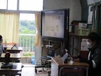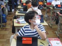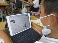 1年生国語の授業の様子です。「たぬきのじてんしゃ」の本文がタブレットに送られましたが、先生が大事な部分を付箋で隠してあります。分からないところは付箋をはがしながら音読しています。