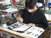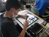 3年生書写の授業の様子です。今日は小筆を使って学年と名前を書く練習をしています。墨の付けすぎと字の大きさのバランスに気を付けています。