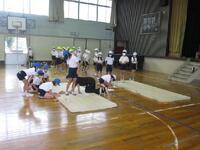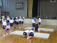 3年生体育の授業の様子です。後ろの人は前の人の肩を持って腕を伸ばして進んでいます。次に手を引いてもらいまっすぐな姿勢をつくっています。どちらもバディでの活動で推進力を生みだしています。