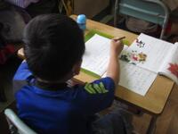 ひらがなの学習が順調に進んでいます。今日は「め」の練習でしたが、形がとりにくいようで、いつもより苦戦している様子が見られました。ワークシートを書いては消し、また書いては消しと、納得のいく字にしようと頑張っています。「めのつく言葉は?」の問いかけに、「はい!」と、たくさんの手が挙がっていました。
