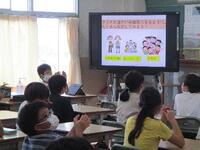 歯科医師、歯科衛生士の方々に来ていただき、健口教室を行いました。虫歯の原因とその予防、歯磨きの仕方について指導していただきました。子供たちは真剣に話を聞き、虫歯にならないために甘い物を控えることや、歯磨きをして口の中をきれいにしてから寝ること、優しく歯を磨くことについて学びました。虫歯にならないように気を付けようとする姿勢が見られました。