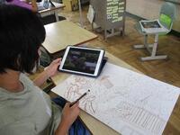 工作「カラフルフレンド」が出来上がり、子供たちが校庭のお気に入りの場所で、記念撮影をしています。鉄棒に並んで腰掛けたり、ジャングルジムに上らせてみたり、一緒に雲底を楽しんだりと、タブレットを活用し、それぞれこだわりの写真を撮影することができました。