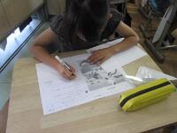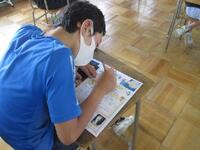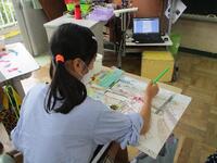 6年生の図工の様子です。校舎の窓から撮影した写真を基に、風景画を描いています。本校は高台に位置しており、窓から住宅地や富士山を含めた山々の稜線がきれいに見えます。遠近感を出そうと丁寧に線を描き、色を重ねているこの作品、完成が楽しみです。