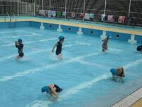 1年生体育の授業の様子です。満水になったプールに入って、歩いたり、もぐったり、スキップしたりして気持ちよさそうです。太陽が出てきて絶好のプール日和となりました。