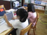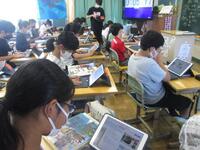 総合的な学習の時間の調べ学習の様子です。「福祉」をテーマに、子供たちは自分の課題を設定し解決のための情報を集めています。タブレットで検索する子もいれば、図書室の本を活用する子もいます。いろいろな手段を使えることは大切なスキルです。