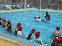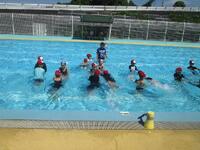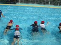 3年生体育の授業の様子です。後ろの人は前の人の肩を持って腕を伸ばして進んでいます。次に手を引いてもらいまっすぐな姿勢をつくっています。どちらもバディでの活動で推進力を生みだしています。