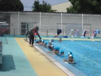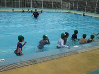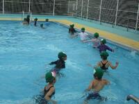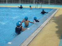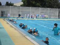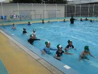 1年生体育の授業の様子です。満水になったプールに入って、歩いたり、もぐったり、スキップしたりして気持ちよさそうです。太陽が出てきて絶好のプール日和となりました。