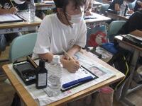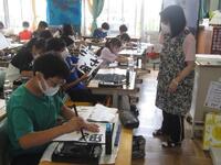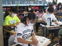 3年生書写の授業の様子です。今日は小筆を使って学年と名前を書く練習をしています。墨の付けすぎと字の大きさのバランスに気を付けています。