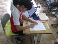 2年生は算数の単元テスト(1000までの数)に挑戦中です。足し算や引き算、数の大小、数字の表し方など授業で学習した様々な問題が出題されています。みんな集中して取り組んでいます。