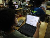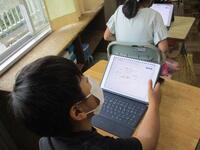 4年生算数の授業の様子です。角の練習問題に取り組んでいます。先生に聞いたり、友達に聞いたりして分からないところを理解しながら解いています。2つの三角定規のそれぞれの角度をしっかりとおさえておくといいでずね。
