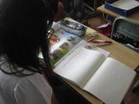 4年生国語の授業の様子です。自分で決めたテーマをもとに、図書室にある本を参考にどのような文化の違いがあるかをまとめています。最終的に調べた内容を自分の言葉で文章にして説明をしていきます。