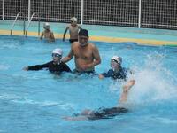 2年生体育の授業の様子です。今週からプールが満水となりました。2年生がプール内をぐるぐると回っています。水流がついたところで、逆方向へ移動しようとしますが、水の流れでなかなか思うように進まないようです。腕を水の外へ出すと動きやすくなります。