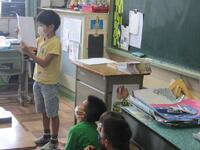 絵日記に書いた夏休みの思い出をみんなに紹介しています。韮山に電車で行ったこと、クワガタと遊んだこと、キャンプしたこと、三島の夏祭りに行ったことなど、楽しくて有意義な夏休みの様子がよく分かりました。
