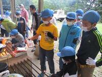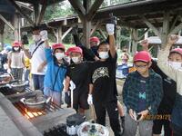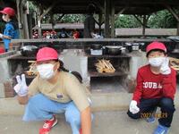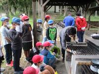かまどにきれいに薪を並べ終わり、いよいよ着火です。丸めた新聞紙に火をつけ、その火が薪に燃え移るとやがて大きな炎が・・・。「やったぞ!」「成功!!」「うまい!」等弾んだ声が聞こえてきます。思わずガッツポーズをする子供たちも。普段の学校生活では味わえない素敵な体験をしています。