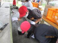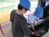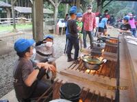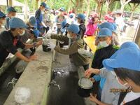 ウォークラリーの後は、飯ごう炊飯の準備です。お米を上手に炊くには、水加減が重要です。子供たちは、お米をこぼさないように丁寧に飯ごうに移し替え、真剣な表情で何度も水加減を確かめていました。さあ、おいしく炊けるかな?