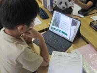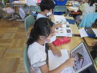 2年生国語の授業の様子です。2つのものを比べる学習です。図鑑から対象としたい2つのものを探し出します。その2つについて図鑑をじっくり読んで、何が違うのか、どんなところが違うのかについて分かりやすくまとめています。