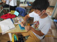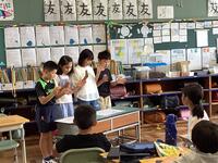 1年生が小学校初めての夏休みを前に、夏休みに読む本を2冊ずつ借りました。自分の興味のある本を一生懸命探す1年生です。貸し出し手続きのやり方もしっかり身に付いてきました。貸し出し手続きが終わると、さっそく本を読み始めている1年生でした。この2冊の本は、夏休みが終わって登校した際に返却手続きを行います。