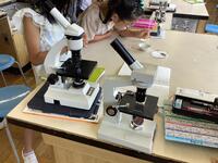 5年生理科で光学顕微鏡の使い方を、試料にメダカの稚魚を使って訓練しました。稚魚は動くので親指を使って追いながら観察します。