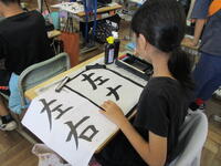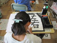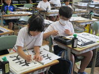 4年生の書写の授業です。今日の題字は「左右」でした。書き順や払い、画の接し方に気をつけ、集中して一画ずつ書き進めていきます。子供たちは、手本をじっくり見ながら慎重な筆運びで、よい作品を書こうと意気込んでいました。