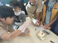 4年生理科で注射器に空気を閉じ込める実験をしました。答えが出るまで、いろいろな工夫が見られました。