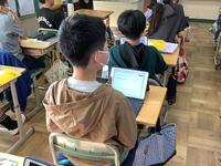 5年生の外国語の授業の様子です。1人1台端末に配布された地図をもとに、「Where is the ~?」と尋ねられたら、「Go straight for 2 blocks.」「Turn left.」などと答え、相手を道案内する内容に取り組んでいました。子供たちは、2人組となって、相互に道案内の練習をしていきました。多くの友だちと繰り返し練習することによって、道案内も上手にできるようになっていきました。
