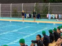 体育のプールでの授業の前に、1年生が水遊びをしました。