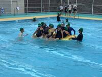 服を着ている状態で水の中に入るとどれだけ動きにくいかを体験することや水の中で救助を待つ際にはどのような姿勢を取ると安定するかなどを体験しました。また、ペットボトル1本でも、その浮力により水に浮かぶことの助けになることを体験していきました。