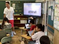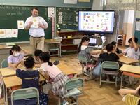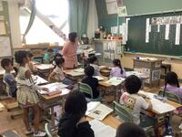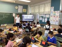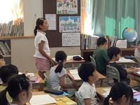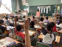 1年生の学級活動の授業の様子です。本校では、1年生も年間3時間の外国語活動を行っています。外国語活動を行うための時間は学級活動の予備時数を使っています。