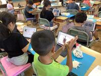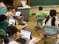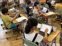 5年生の学級活動の様子です。新しい係活動を決めて、子供たちが活動紹介のカードづくりに1人1台端末を使って取り組んでいました。