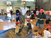 はじめに、かかし作りのポイントを教わりました。続いて、各クラス3つのグループに分かれてかかし作りにチャレンジです。かかしの骨組みはすでに組み立ててくださっていたので、わらを束ねて胴体を作ったり、用意した服を着せたり、籾殻を入れた頭を付けたりしていきます。