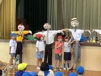 子供たちは、自分たちの考えていたアイデアを生かして、組み立てていきます。服をクラスカラーに塗ってみたり、こだわりポイントをかかしに付けていったりと、それぞれ特徴のある9体のかかしが仕上がっていきました。