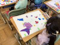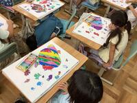 1年生「図工」の様子です。きれいに描いたお魚のまわりを飾っていました。
