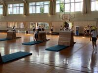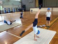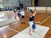 子供たちは、前転・後転等の回転計の技、側方倒立回転等の回転技など、自分の技の精度を上げようと取り組んでいました。