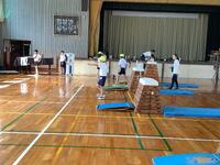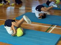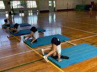 4年生の体育の授業の様子です。体育館でマット運動に取り組んでいました。