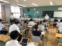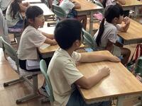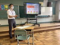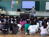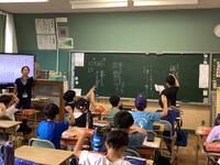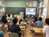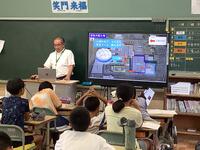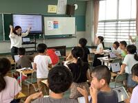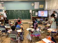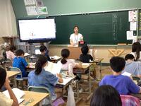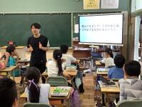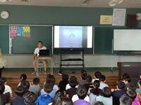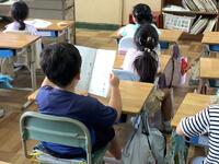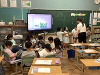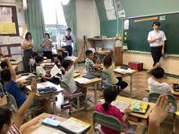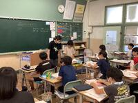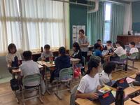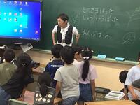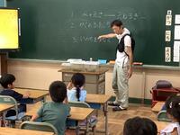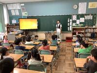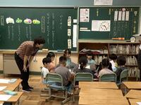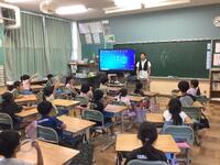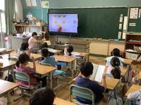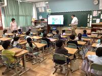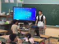 1年生は、生活科の「いきものとなかよし」の単元の学習で、公園に出掛けての自然観察会を予定していましたが、屋外活動をするには熱中症の心配を伴う状況であったため、教室でのこん虫の身体のつくりや飼い方についてのお話を聞くことになりました。本日の講師は、常葉大学非常勤講師の加須屋先生です。
