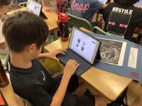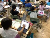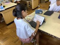 4年生の図画工作の授業の様子です。先日完成させた版画の作品の鑑賞に取り組んでいました。友だちの作品を見て、その作品のよさを1人1台端末の学習アプリに入力していきます。