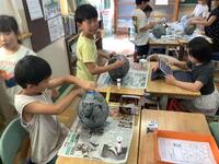 今日は、風船に新聞紙をはりつけます。水でうすくうすめたボンドで貼り付けていきます。