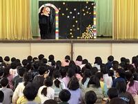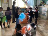 開始前には、手遊び歌で雰囲気を盛り上げてくれました。「へんしんトンネル」は、不思議なトンネルをくぐるとさまざまなものが変身していきます。かっぱがトンネルをくぐると馬に変身したり、時計が毛糸に変身したり、ボタンが田んぼに変身したりします。中には、先生たちにも変身したりして…。