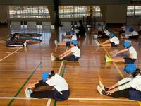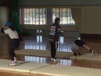マット運動のための柔軟体操・ストレッチを念入りに行い、活動がスタートしました。きれいな後転の仕方や前転、そして、伸膝前転にチャレンジしました。