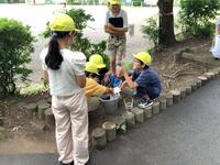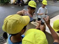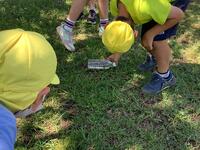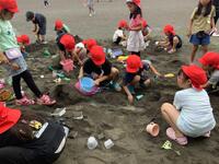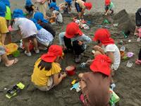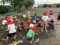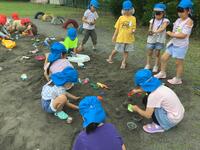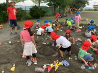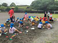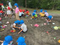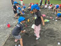 「砂や土に触って、感じながら活動を楽しむ」ことがめあてです。バケツに水を入れて運んできたり、山をつくったりとみんなとても楽しそうに活動していました。