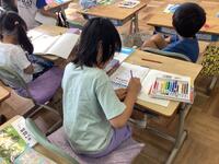 2年生「図工」の様子です。絵の具を使って、色塗りをしていました。魚のうろこに色をつけています。青と黄色でまず塗り、その後、青と黄色を混ぜると何色になるか、ということを試していました。青と黄色、みんな同じように混ぜているのに、できた緑色が違います。色の違いを楽しみながら作品を作っていました。