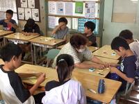 5年生「家庭科」の様子です。昨日のクラス同様、ボタンどめをしていました。こつをつかんだようで、あっという間にできている子もいました。とてもきれいにボタンどめができている子もいて、驚きました。