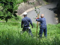 5月20日(土)に、本校校庭の外側、南側の斜面(法面)に、桜の苗木を10本植樹しました。御協力いただいたのは、川井林業さんです。数年後、数十年後の景観を考え、南側から本校を見上げたとき、素敵な桜の花々が目に入るようにと植樹してくださいました。日当たりよく風通しもよいこの傾斜地で、桜の苗木がのびのびと大きく育ち、美しい花をたくさん咲かせてくれる日が楽しみです。