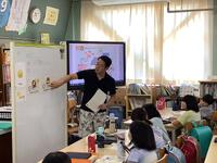 4年生の外国語活動の授業の様子です。「時刻や日課の言い方に親しもう」というめあての学習に取り組み始めました。このめあては、子供たちにとって学校の日常と密着した内容です。子供たちも興味深そうに学んでいました。