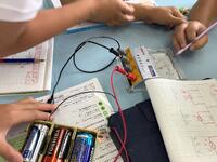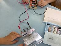 4年生理科で電池を並列に繋いだ時の利点を考えました。何個つなげても1、5ボルトですが長持ちすることを見出しました。電圧計は山田中学校から借りました。