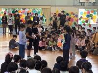 「花をさかせよう」ゲームのあとは、2年生からアサガオの種、3年生からはびゅんびゅんごまをプレゼントをしました。